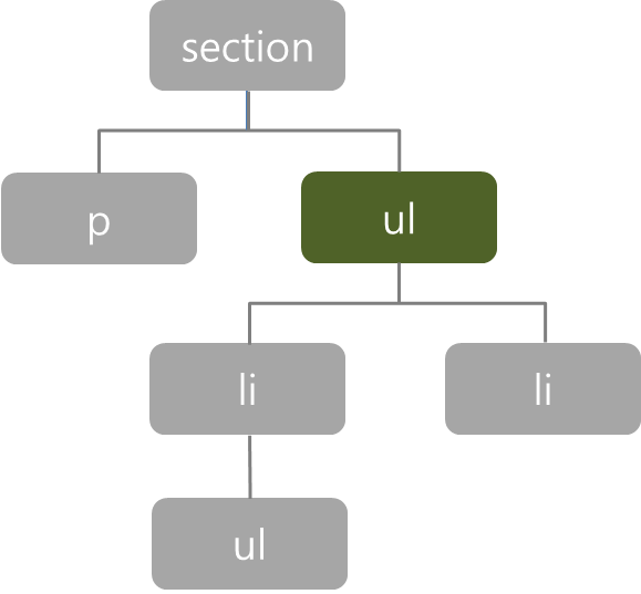 /* CSS */ /* 하위 선택자 */ section ul { border: 1px dotted black; } /* 자식 선택자 */ section>ul { border: 1px dotted black; }