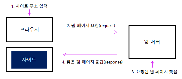 -> 요청을 처리해 알맞은 정보를 전달(서버) -> 클라이언트에 응답(pc, 노트북, 모바일 기기=클라이언트)