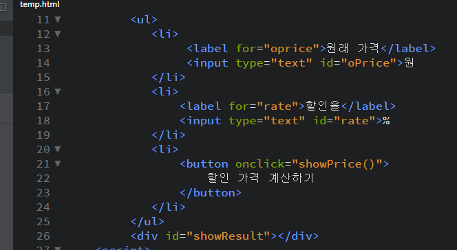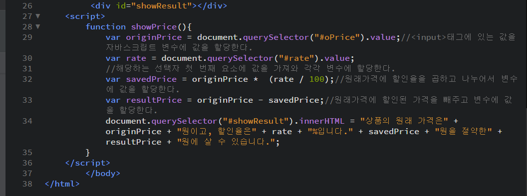 해당하는 선택자(id) 첫 번째 요소들(oPrice), (rate)을 선택하여 value을 가져와서 각각 변수에 할당한다.