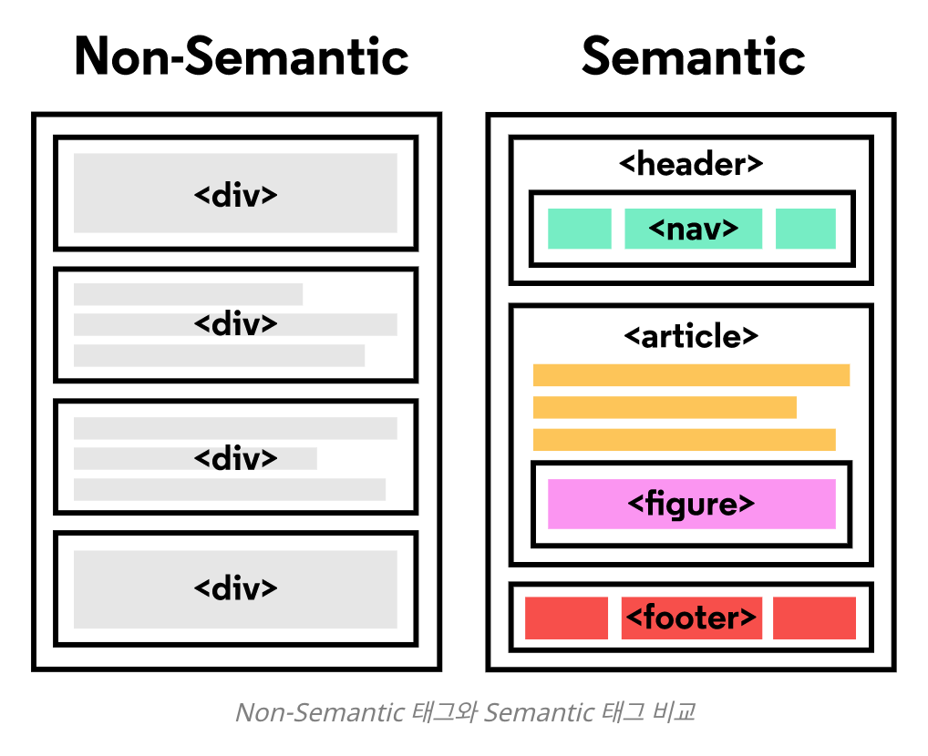 대부분의 구조가 <div> 로만 이루어져 있다면 class, id, css 내용 등을 보고 어떤 역할을 하는 태그인지 유추해야 한다. 이러한 불편함을 개선하기 위해 사람이 이해하기 쉽도록 태그의 이름만 보고도 역할이나 위치를 알수 있도록 만든 태그를 semantic tag라고 한다.