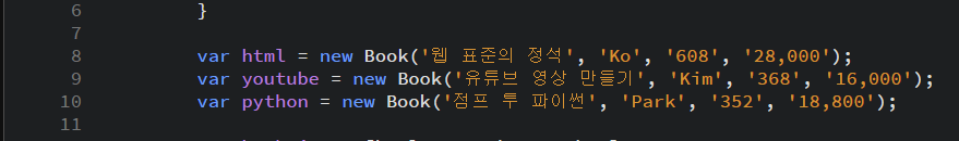 인스턴스를 만들 때는 Book객체를 만들 때 사용한 매개변수에 넣을 값을 지정한다.