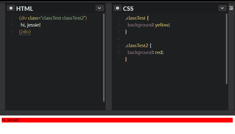 <예시5>에서는 class만 두 개를 주었다. 동일한 우선순위의 선택자 속성이 중복되었을 경우에는, css 파일에서 하단에 위치할 수록 우선순위가 높다.