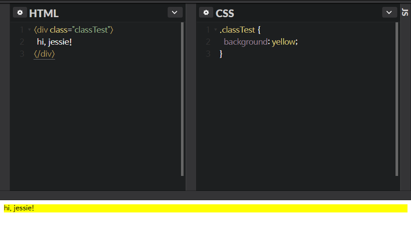 <예시1>에서는, div 태그에 class를 주고, css 파일에서 class 선택자로 선택하여 배경을 노란색으로 설정했다.