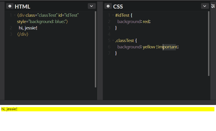 <예시4>에서는 class 선택자로 준 속성 뒤에 !important속성을 붙여주었다. !important를 붙인 속성이 우선순위가 가장