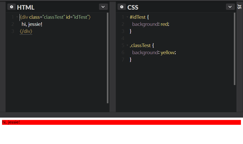 <예시2>에서는 기존 <예시1>에서 id 선택자를 추가한 것이다. css 파일에서 id 선택자로 선택 후, 배경 색을 빨간색으로 설정했다. class 선택자보다 id 선택자가 더 우선순위에 있으므로 id 선택자가 설정한 배경색인 빨간색으로 출력된다.