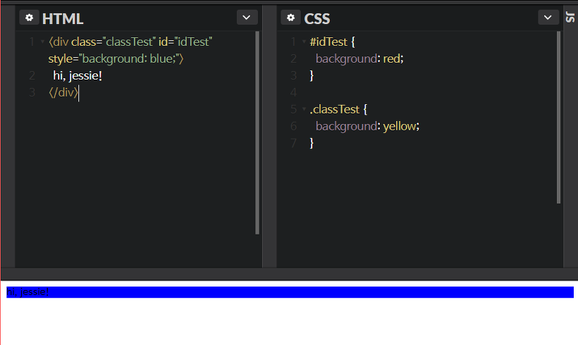 <예시3>에서는 HTML 파일에 직접 style 속성을 주었다. 이렇게 HTML 파일에 직접 스타일 속성을 주는 것은 id나 class 선택자로 속성을 주는 것보다 우선순위가 높다.