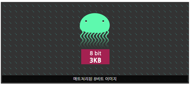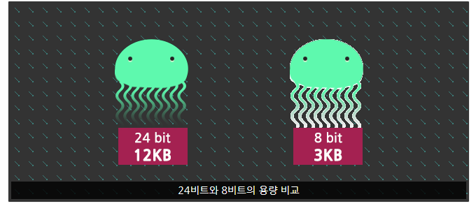 - 하지만 24비트는 용량이 크기 때문에 8비트로 대체할 수 있는 이미지는 최대한 대체하는 것이 좋음.