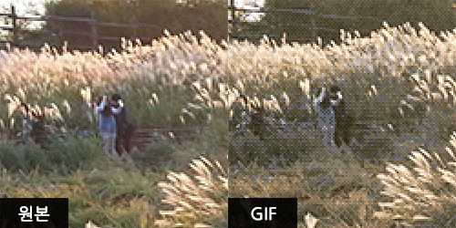 이러한 이유로 256개의 색상은 사진 등의 색상이 많은 이미지를 표현하는 데는 불충분합니다. 아래는 사진을 gif로 저장 했을 때입니다.