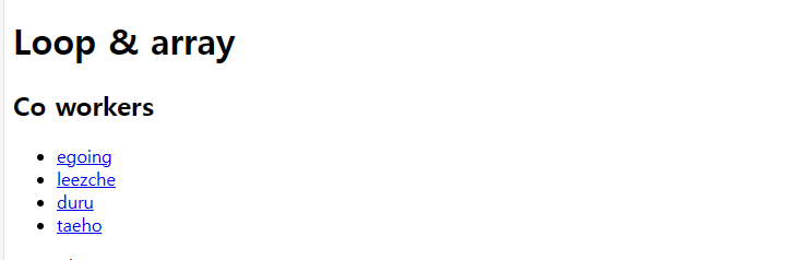 coworkers [i] 변수에 0번째에 있는 egoing부터 ~ taeho 닉네임과 링크 주소가 출력된다