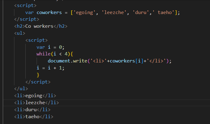 - document.write(coworkers[0]); 변수를 가져옵니다 배열변수 0번째에 있는 egoing 출력 됩니다