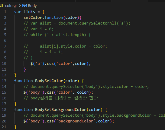 - 자바스크립트 입장에서 볼 때 jquery 라이브러리의 기능은 결국 전역 window 객체에 $()라는 함수 객체를 추가해주는 거 니까 html 내에서 <script>로 jquery.js를 실행시켜 $()를 추가해 주면 color.js도 해당 객체를 사용할 수 있습니다