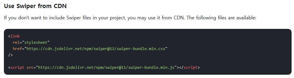 CDN은 그냥 Swiper서버에서 js,css 파일을 가져다 쓰고 <link> 코드로 링크를